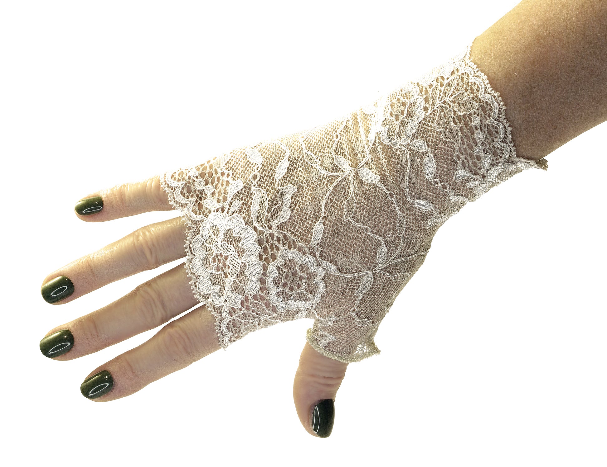 made of net lace, with geometric patterns and pretty scalloped edge, art deco style, slightly elastic and with thumb to slip in, one right and one left glove