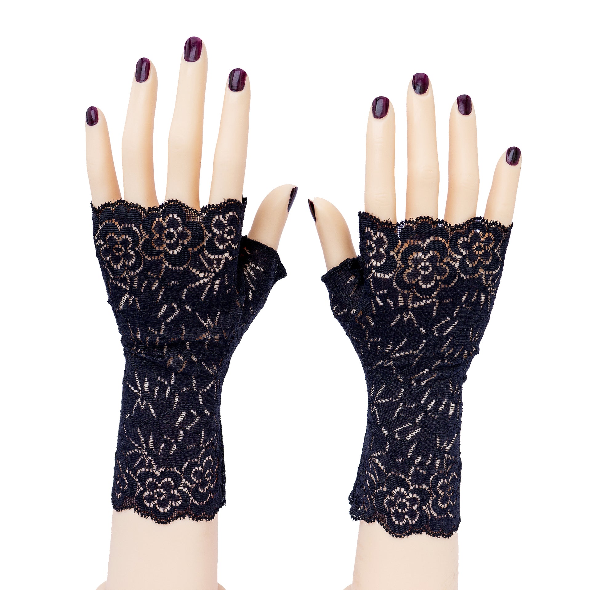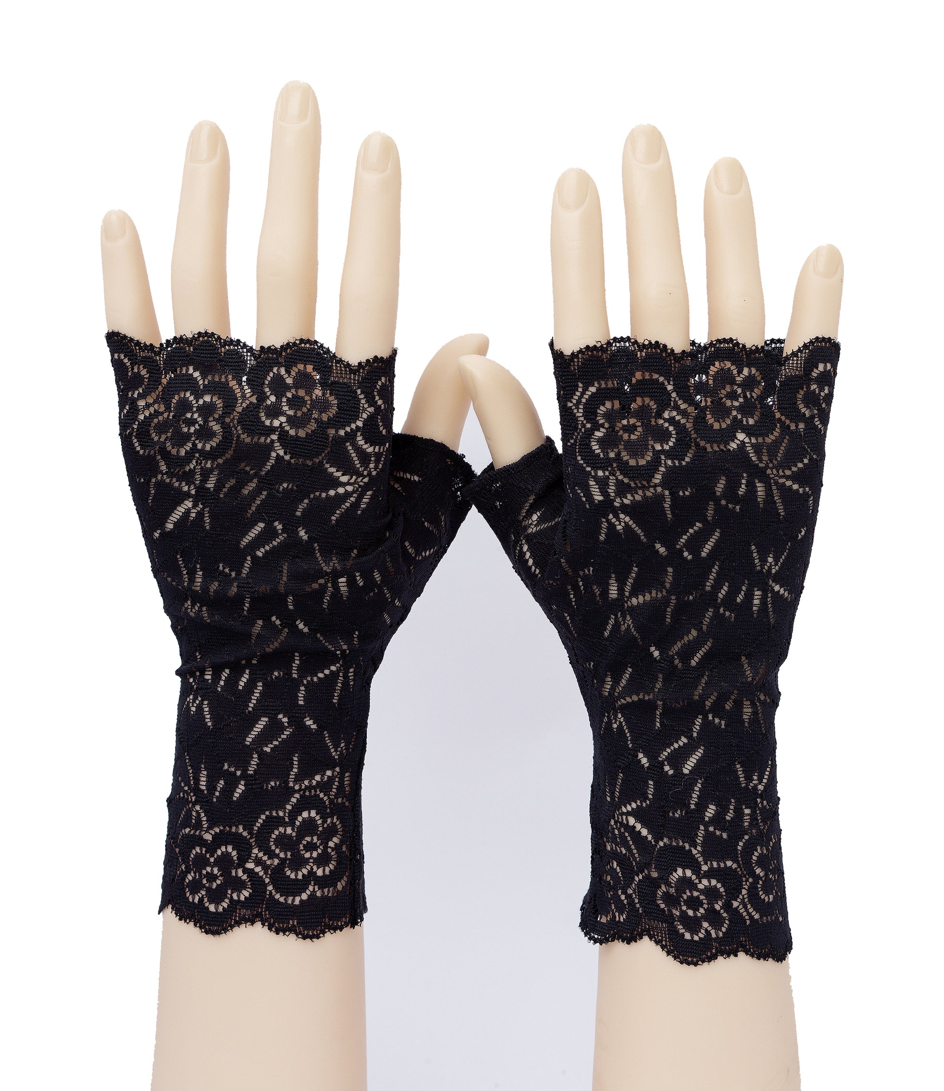 Dentelle opaque pour lingerie, confectionnée avec soin, ornée d'un motif floral abstrait et d'un petit bord festonné, légèrement élastique et munie d'un pouce pour enfiler le gant, un gant droit et un gant gauche.