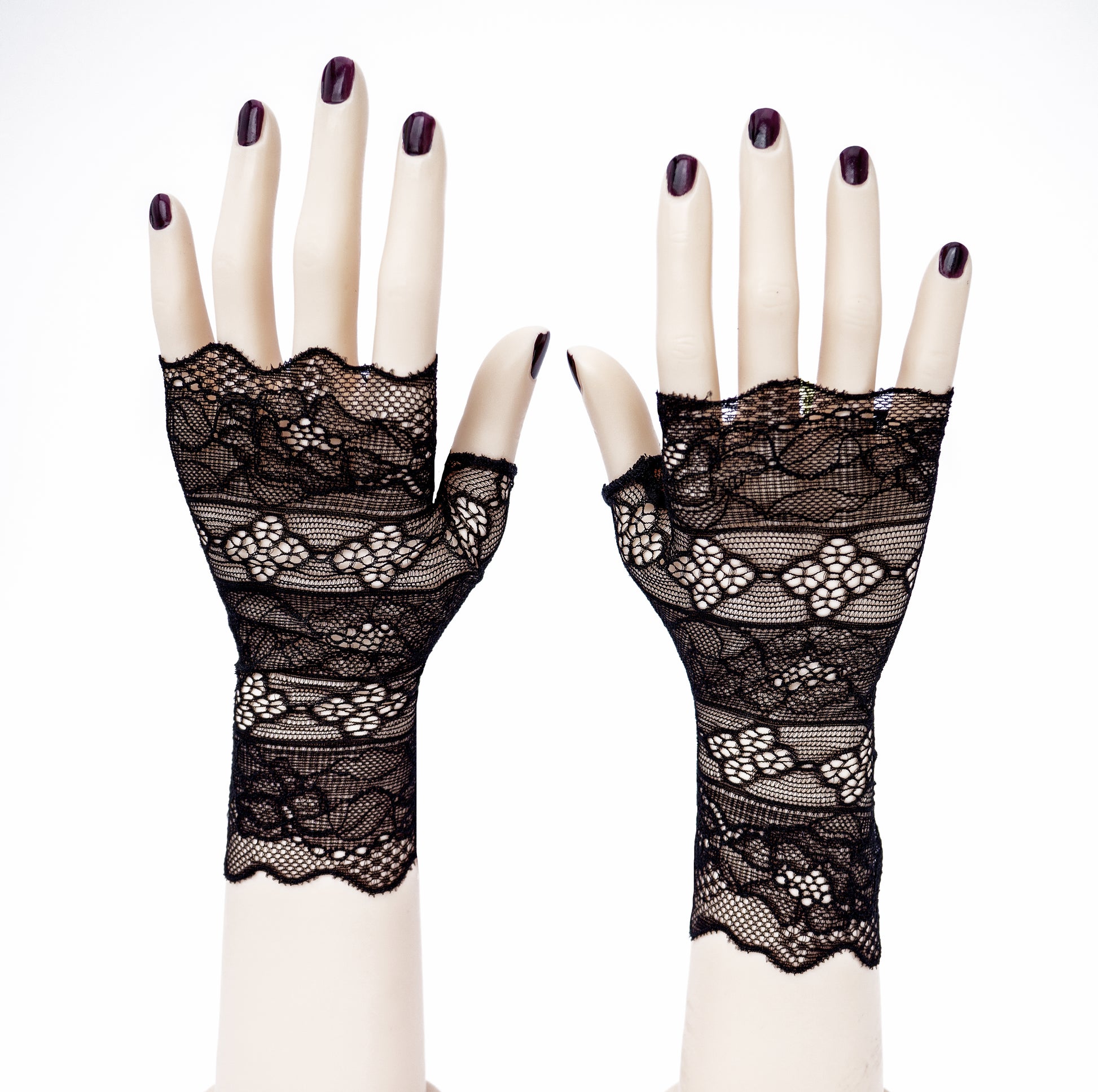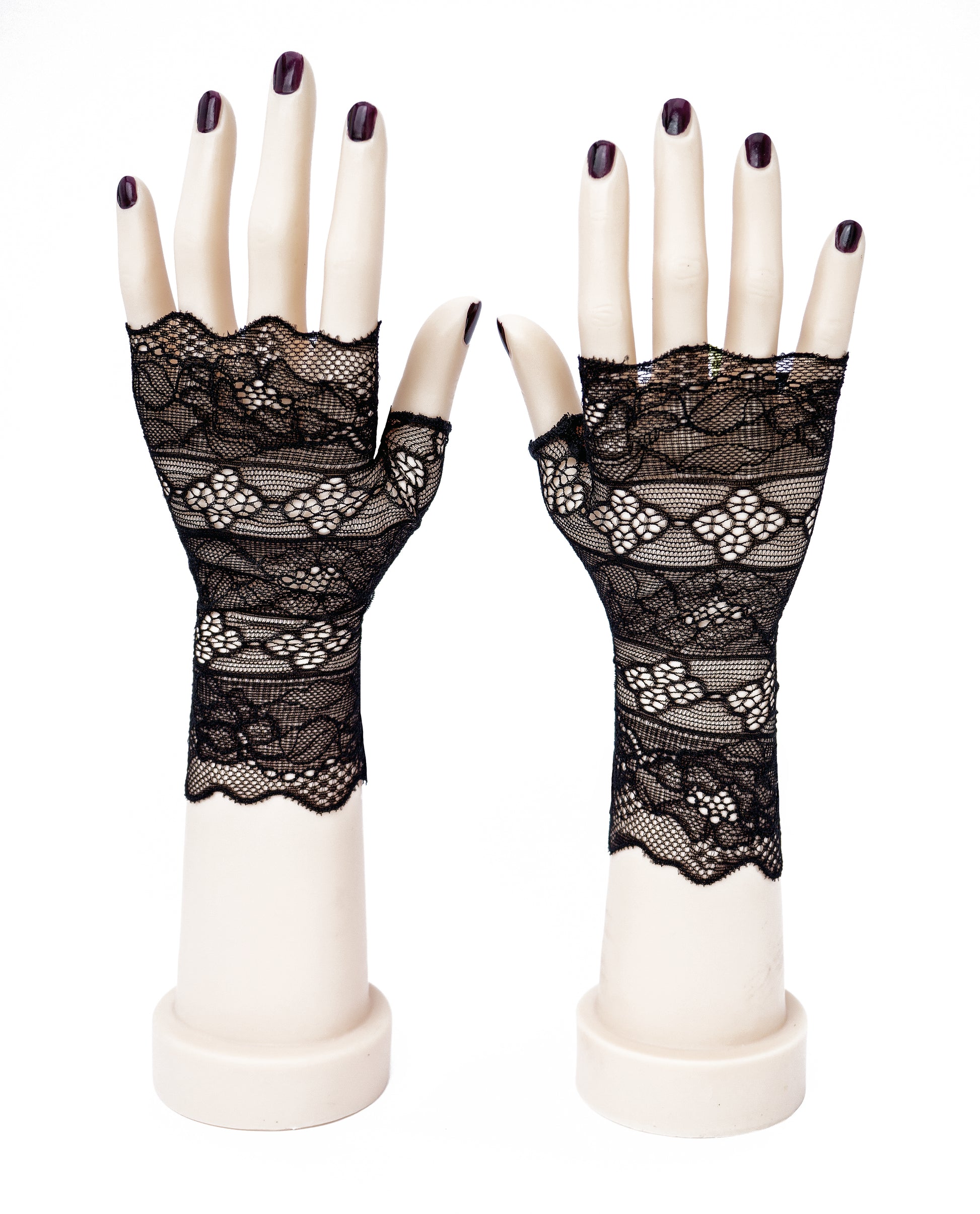 Fabriqués en dentelle ajourée à rayures géométriques, délicats et aériens, mais néanmoins robustes, légèrement élastiques et dotés d'un pouce pour faciliter l'enfilage, un gant droit et un gant gauche.