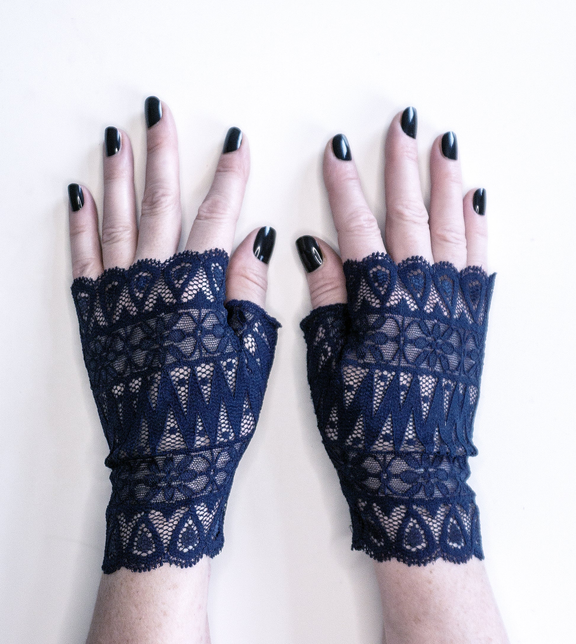 Dentelle Textronic de fabrication allemande de lingerie, qualité supérieure, bord festonné, motif Art nouveau (formes géométriques et fleurs), avec pouce pour faciliter l'enfilage, un gant droit et un gant gauche