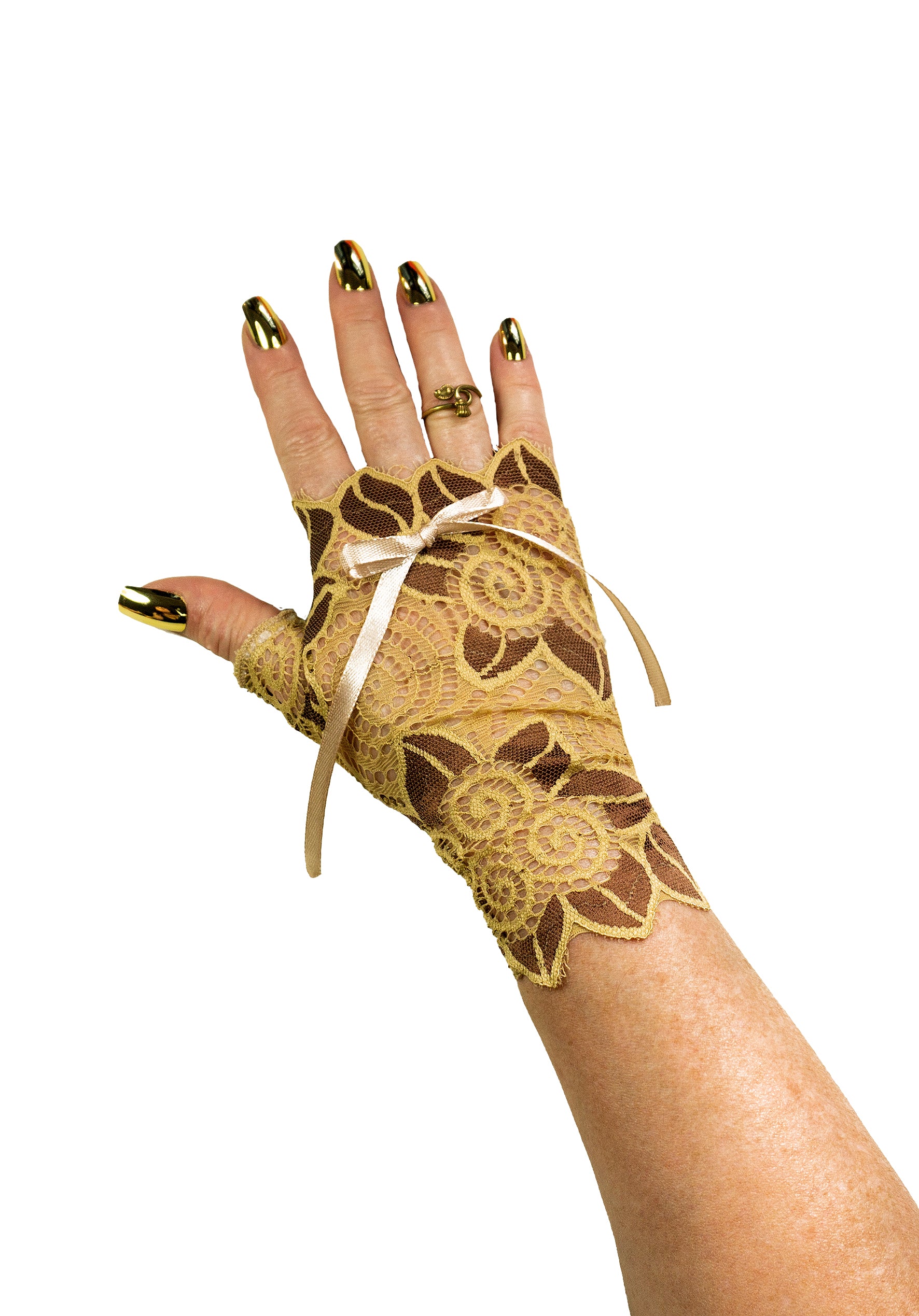 La dentelle est ornée de grandes fleurs noires, dont les pétales sont dorés et brillants, avec un bord festonné de feuilles ; un accessoire très remarquable de style Art déco, décoré d'un nœud en satin, élastiqué et muni de passe-pouces pour faciliter l'enfilage, un gant droit et un gant gauche.