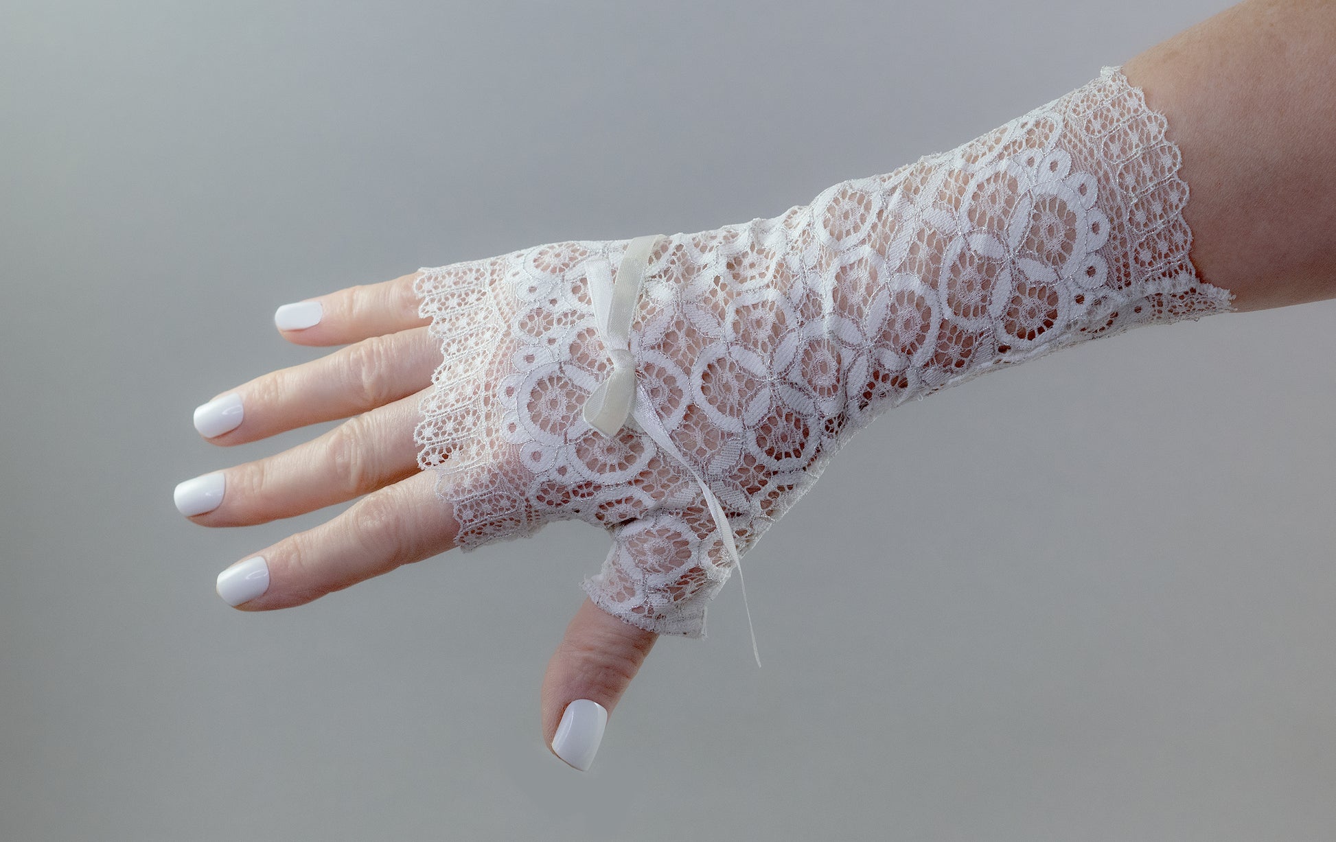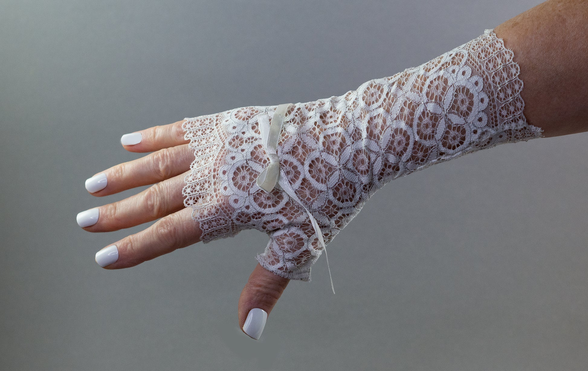 Gant en dentelle résille à motifs géométriques, joli bord festonné, style art déco, légèrement élastique et muni d'un pouce pour l'enfiler, un gant droit et un gant gauche