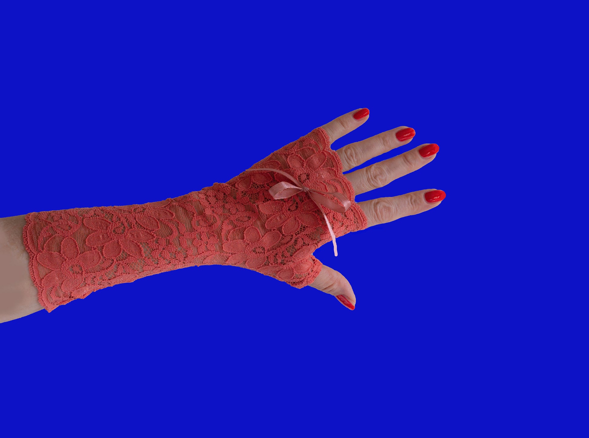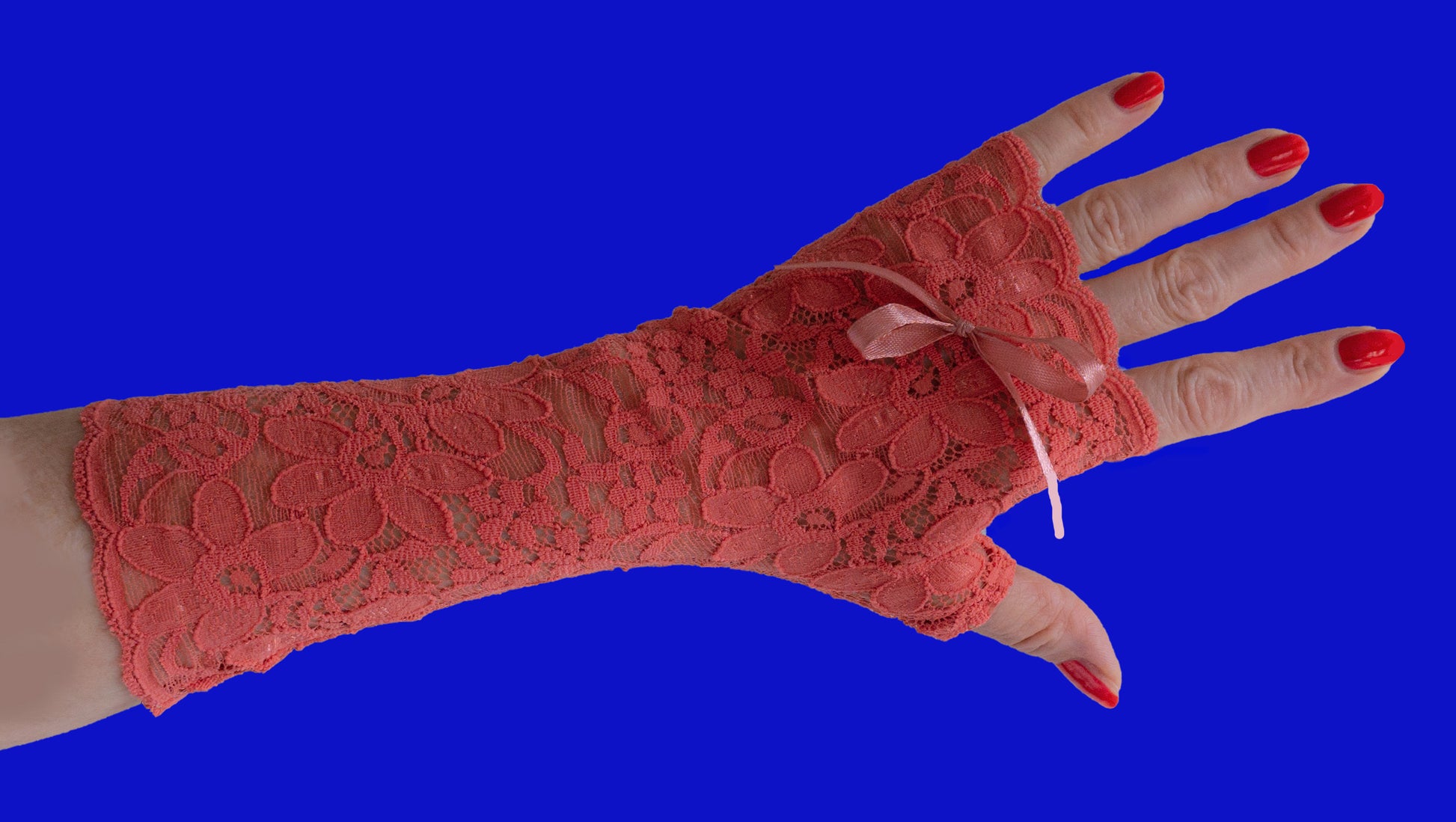 Tissu de dentelle épaisse avec un petit bord festonné et un grand motif floral, élastique et avec un pouce pour faciliter l'enfilage, un gant droit et un gant gauche.