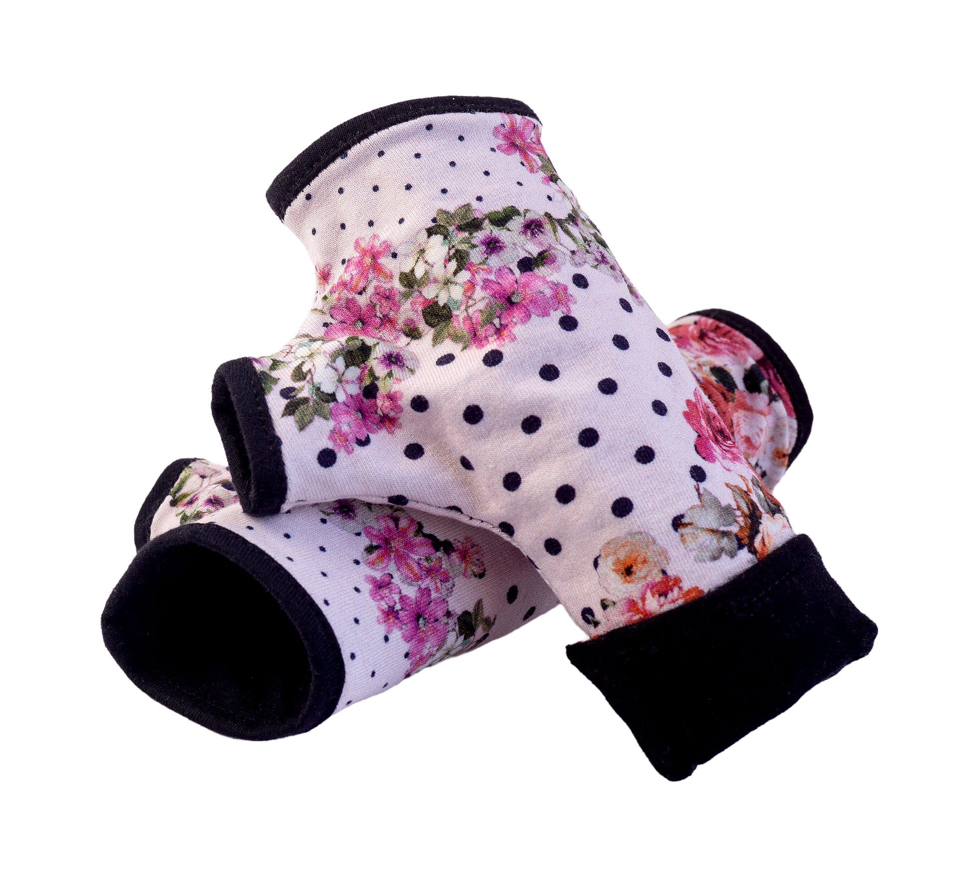 Mitaines en jersey doux, ULTRA CONFORTABLES #INDISPENSABLE, à motifs colorés, doublées (couleur de la doublure au choix), avec nœud.