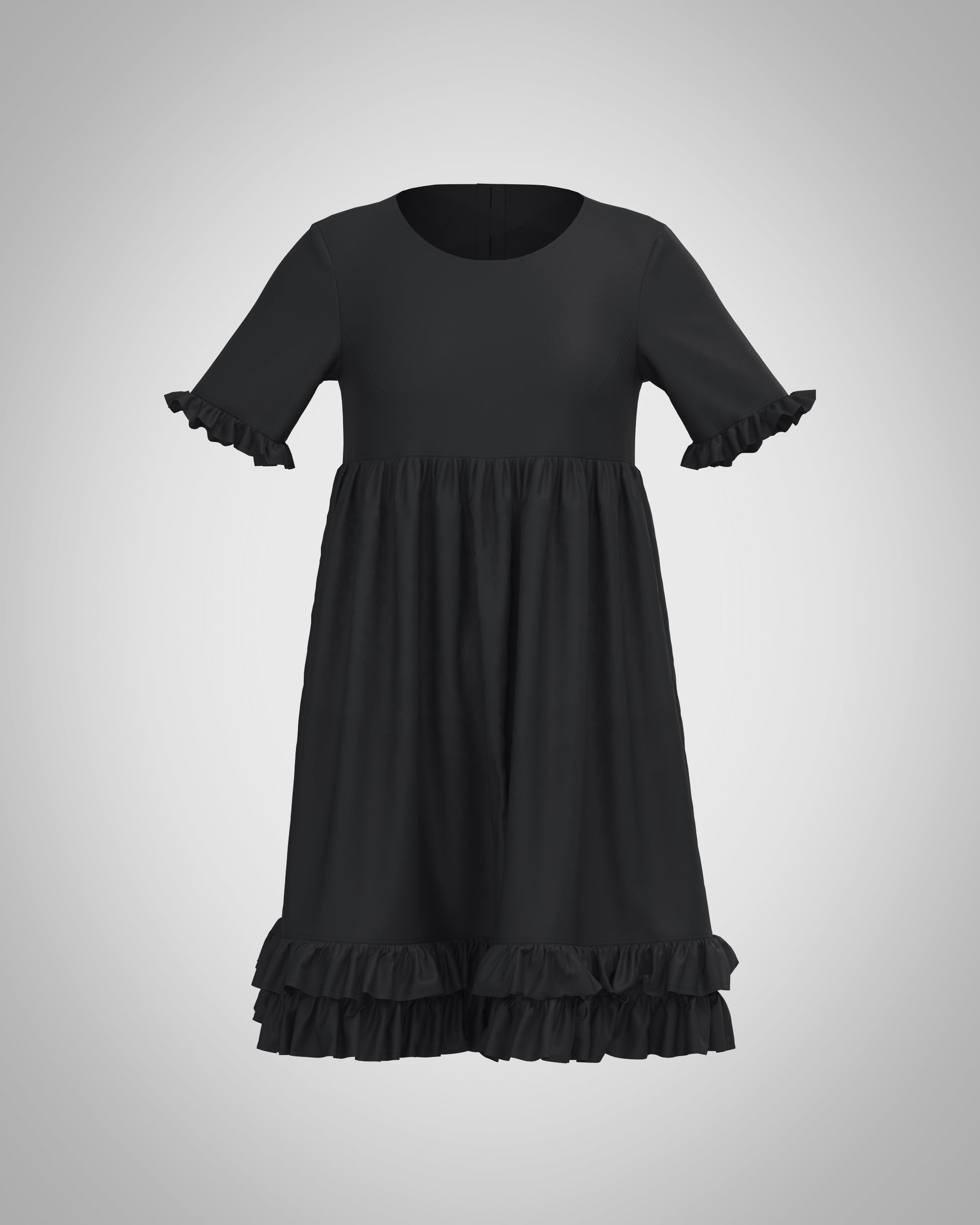 Einzigartiges Unikat in midi-Länge mit weit schwingendem Rock. Bestehend aus einem Oberteil mit Kurzarm, Rüschen um den Ärmelsaum, am Rücken mit Knopfleiste; und einem gerafften Unterteil/Rock, am Saum mit zwei Lagen Rüschen besetzt.