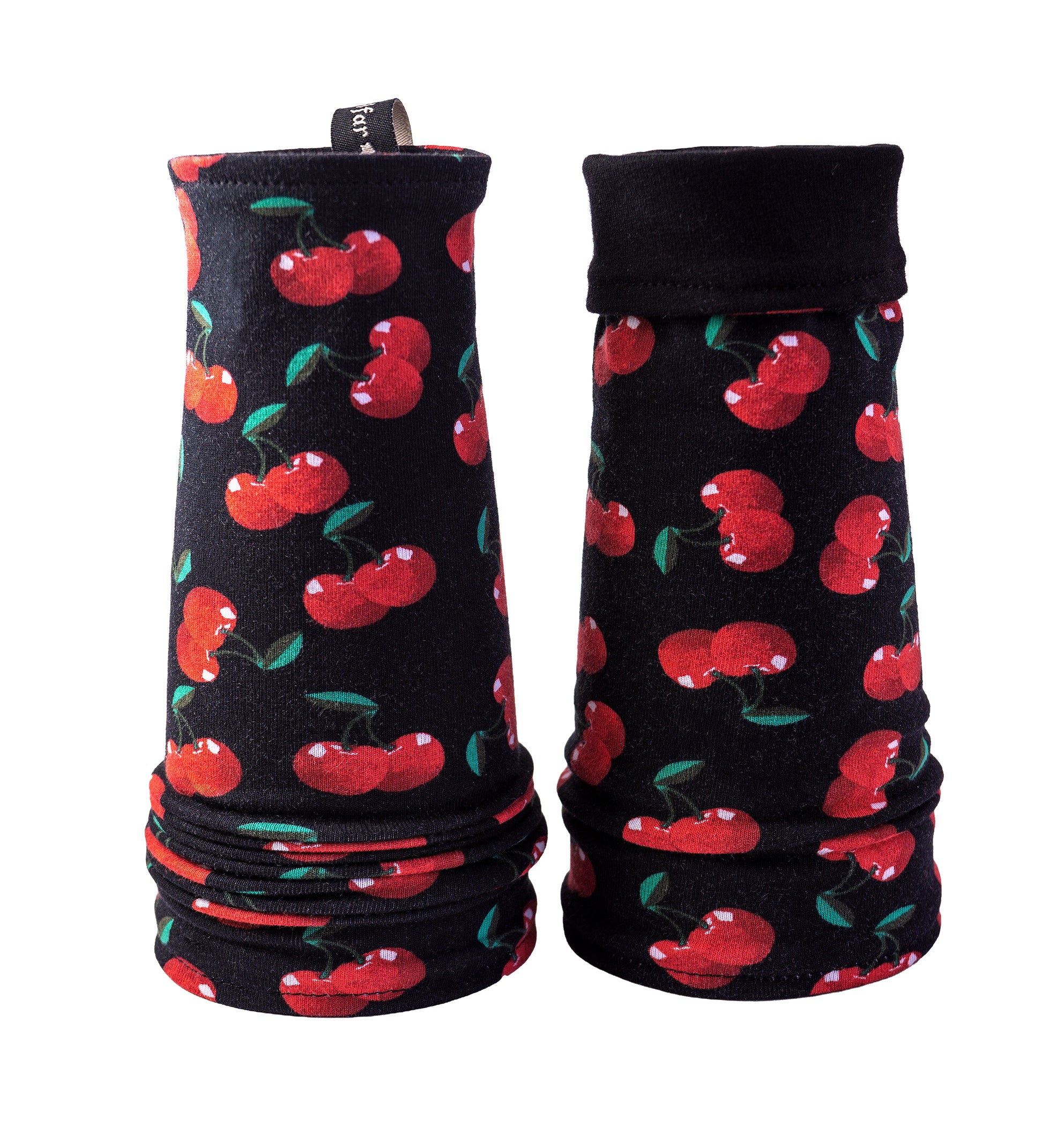 eine Seite schwarz oder rot wählbar, andere Seite gemustert mit Kirschen